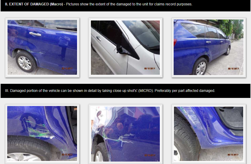 - Vehicle Pictures (showing damaged portions, whole vehicle on the damaged side, and one showing your vehicle with plate number). Please refer to the guidelines here and here.